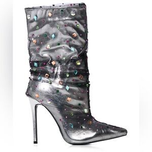 Live Your Popstar Fantasy Irl in the Azalea Wang Liora Silver Gem Bootie. These Metallic Booties Feature a Faux Leather Fabrication, a Ruched Tulle Overlay, a Pointed Toe Silhouette, a Mid-Calf Height Shaft, a Pull-On Fit, and a Stiletto Heel. Complete with Multicolor Gemstone Accents Throughout.