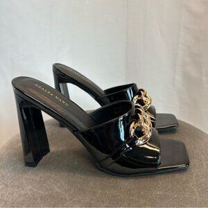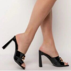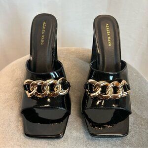 Azalea Wang black patent chunky heel gold chain open toe slide high heels Sz 9