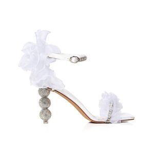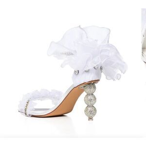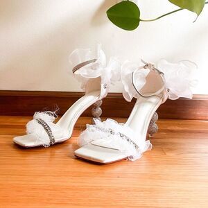 Azalea Wang Maemae White Bridal Heels in white. Sweet like your favorite treats. The AZALEA WANG Candy Bling Ruffle Bubble Heel Sandal In White features a shimmering satin textile upper, an open square toe silhouette, a thin toe band, a cushioned faux leather insole, and a rhinestone-embellished bubble heel. Complete with ruffled organza accents at the toe and ankle and rhinestone link strap detailing. In good condition, minor unraveling — see photos. No holes, rips, or stains. Ours is a smoke free home.