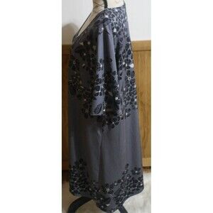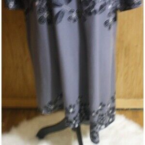 Women's pullover asymetrical short sleeve knit dress. Gray with black & white flowers. Machine washable polyester & spandex blend material. No stains or rips.
