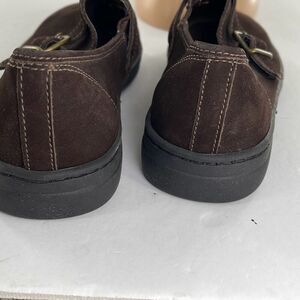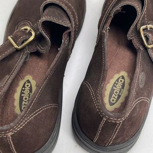 Azalea size 6 brown suede loafers. Elastic stretch strap with adjustable buckle. Gently worn