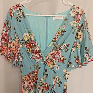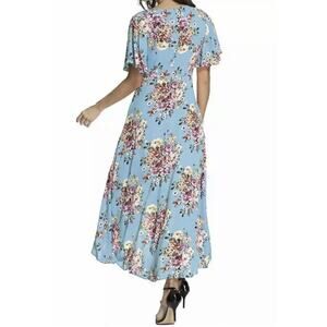 Azalosie Women size M Blue Floral Faux Wrap Low High V-Neck Midi Dress 100%Rayon
