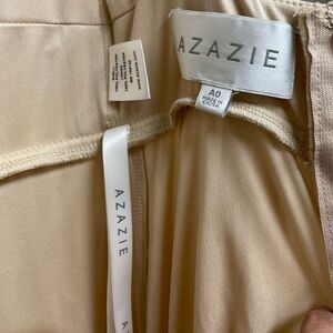 New with tags Azazie Belize Dress in Champagne – Size A0. This elegant gown features a deep V-neckline, empire waist, and flattering A-line silhouette with a thigh-high slit. Perfect for weddings, formal events, or bridesmaids.