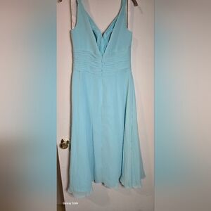This stunning blue sundress by Azazie features a ruched bodice and a plunging neckline, perfect for wedding guests. The sleeveless design and flowing A-line skirt create an elegant silhouette, making it an ideal choice for special occasions.
