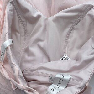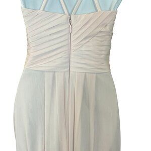 This Azazie gown features a timeless A-line silhouette with a pleated bodice, offering a sophisticated style. The strappy design and blush pink hue enhance its elegance, making it suitable for formal occasions. Lined and padded for comfort, it exudes a refined charm.
