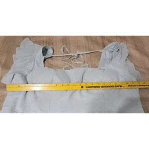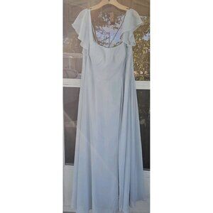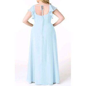 The Azazie Bondi A Line Chiffon Ruffle Dress in Sky Blue Plus Size 22 is a stunning formal dress perfect for weddings. Made of polyester chiffon with a solid pattern and zip closure, this long dress features flutter sleeves and ruffle accents for a touch of elegance. The plus size design ensures a comfortable and flattering fit, while the dress is lined for added sophistication. Ideal for summer and spring occasions, this dress exudes a timeless A-Line style with a touch of modern flair, making it a standout choice for any event. It measures 61 inches in length.