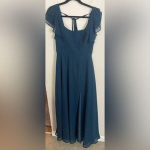 Bondi is our gorgeous bridesmaid dress cut from chiffon. She features a square neckline with flutter sleeves and a self tie scoop back. The look is complete with an A-line skirt paired with a leg slit.