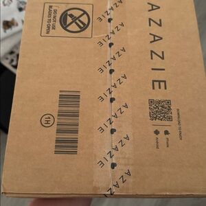 Sturdy Azazie cardboard box with branded tape. Ideal for secure shipping. Never been worn