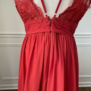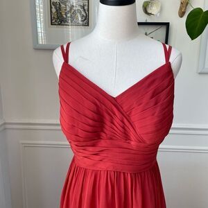 Azazie women’s burnt rusty orange chiffon, flowing formal gown or bridesmaids dress with strappy lace detail in the back. Perfect for desert hue themes or an autumn color palette. 100% polyester chiffon. Measurements are approximate and taken while laying flat: 58 inches shoulder to hem, 17 inches straight across the waist and 21 inches armpit to armpit with lightly padded bust, reducing the need for a bra.