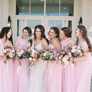 Beautiful Molly Style Azazie bridesmaid dress. Size A6. Bust 35 in. Waist 28.5 in. Hips 38.5 in. Hollow to hem 59 in. Light dirt on the bottom and has not been hemmed. Pictures show dress on with bridesmaids!