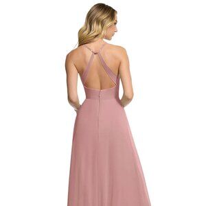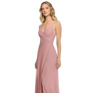 Look classically elegant wearing the Davis dress. Made from chiffon, this bridesmaid dress features a V-neckline surplice bodice with pleats. Her A-line skirt is overlapped and creates a leg slit when walking. Her delicate spaghetti straps lead to an alluring open back with a keyhole and a self-covered button closure.