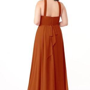Dixie is a clean and chic choice for your bridal party. Featuring an overlapped halter V-neckline, this modern bridesmaid dress has straps that are decorated with pleats. Her chiffon, floor-length skirt is cut in an A-line silhouette with tucked pleats on the front skirt, and boxed pleats on the back. She is completed with a lovely waist sash.