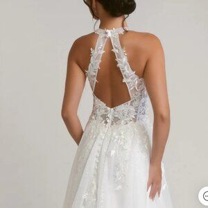 Let your day be perfect with our dazzling and light-catching A-line gown, Dysis. Her illusion halter neckline is adorned with hand-sewn lace that drapes around the neck and onto her keyhole back. Buttons are sewn down the zipper and the A-line skirt has floral lace appliques that cascade down the chapel train.