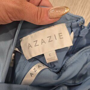 This Azazie dress is a sophisticated addition to any wardrobe. Crafted with precision from smooth polyester, its elegant cowl neckline and spaghetti straps make it suitable for both casual and formal settings. The light blue hue adds a touch of serenity, and the slight draping at the waist enhances its graceful silhouette. Whether for an evening occasion or an intimate gathering, this dress offers a timeless appeal that is both understated and captivating.