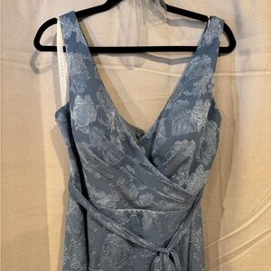 Azazie Atelier Louise Style dress, color is dusty blue, is a women’s size 16, brand new never worn (though tag has been removed). This romantic design features a plunging neckline, self-tie waistband and maxi skirt with a slit.
