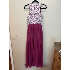 Own the room in this enchanting Azazie maxi dress. The dress features a sleeveless design, perfect for warm evenings and confident movement. A delicate white lace bodice adds a touch of sophisticated charm, contrasting beautifully with the rich purple skirt. The flowing skirt creates an elegant silhouette, making it ideal for formal occasions where you want to stand out without compromising on style. Perfect for a wedding guest outfit, an upscale dinner, or any formal event where you wish to exude timeless grace and charm.
