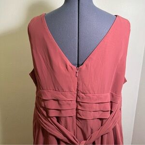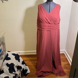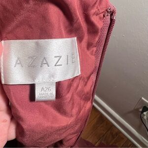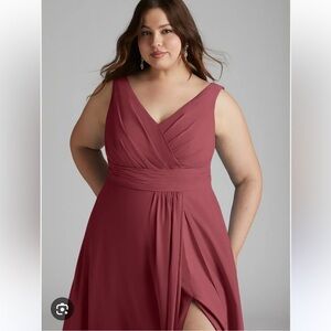 Great condition. Azazie. Nelly Chiffon Bridesmaid Dress. Merlot color. Have your bridesmaids comfortable yet stylish while wearing our stretch chiffon A-line dress, Nelly. Her V-neckline has gorgeous pleating and wide shoulder straps. The A-line skirt has a leg slit that flows easily with every step. We have also included pockets!