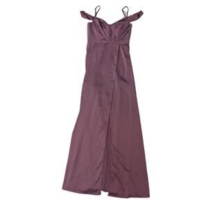 This bridesmaid dress features a pleated surplice bodice with off-the-shoulder sleeves and spaghetti straps.