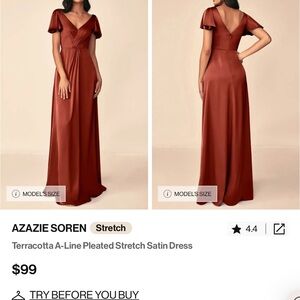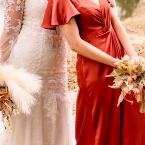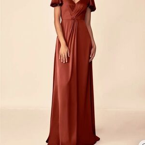 Elegant rust-colored dress. Features short ruffled sleeves. Long flowing skirt. Perfect for formal occasions. Worn twice. Second owner. Has been dry cleaned prior to wearing, will most likely need again