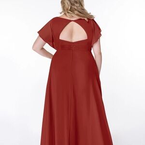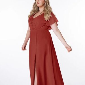 Step out in style with this elegant terracota evening gown. Perfect for any formal occasion, this dress features a flattering silhouette and a chic slit for added allure. Wore once for a wedding never altered. Original length and measurements.