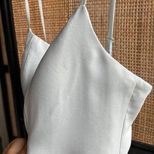 Azazie Tayla Blue Mist- hemmed to fit 5’3 height with 2-3” heels to just skim the ground. Dress has been worn once and is cleaned. There are two small spots on it shown in the photos