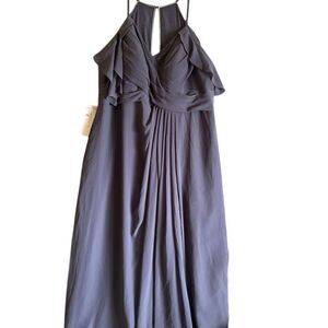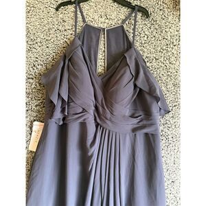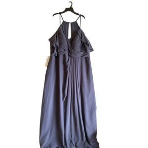 The Azazie Daxton gown is a floor-length dress designed for formal occasions. It features chic pleating and ruffle details with spaghetti straps and a V-neckline. Made from polyester, this sleeveless gown in purple is perfect for weddings, galas, or any formal event. It has a zipper closure and requires dry cleaning. The dress is new. Keywords: Azazie, Daxton, floor-length, gown, formal, purple, V-neck, sleeveless, polyester, chic pleating, ruffle details, spaghetti straps, zipper closure, dry clean.