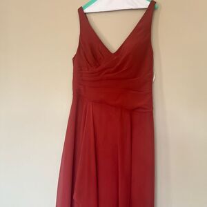 Azazie Cori dress, size A14 in the color Teracotta. This dress is clean and ready to wear. The size is A14 with hem alterations to accommodate heights from 5’3-5’7 depending on heel choice.