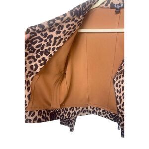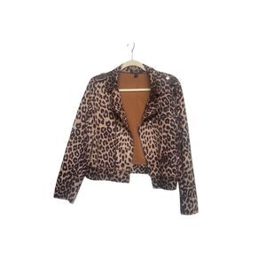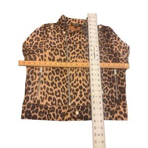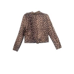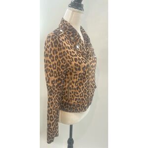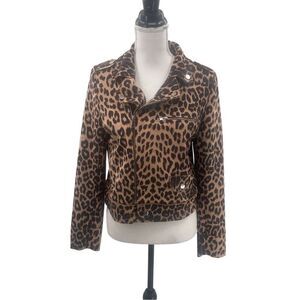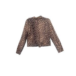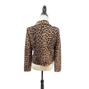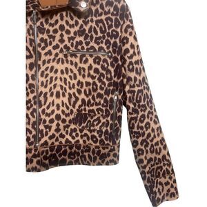 A.Z.I New York women’s jacket in a bold allover leopard print. Features a cropped fit, notched lapels with silver-tone snaps, asymmetrical front zipper closure, and multiple zippered and snap pockets. Made in China. Size small.