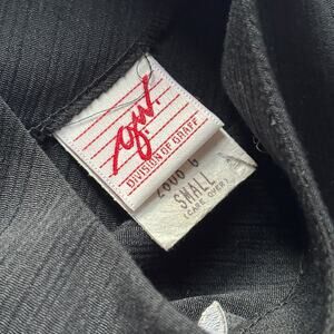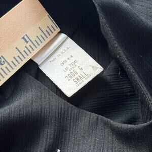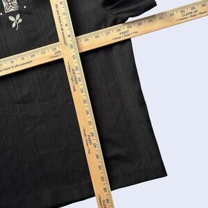 Minimalist vintage short-sleeve blouse in black with a boxy fit, subtle chest embroidery, side slits and a back-neck zip. Lightweight textured crepe feel. 1990s/Y2K vibe with clean, office-core styling and fine vertical texture. Condition: Good, gently used.