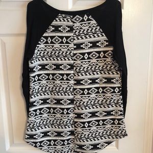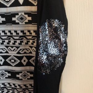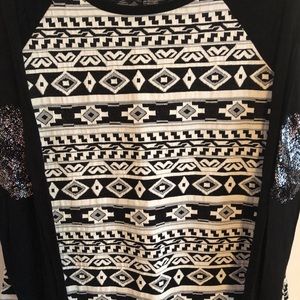Long sleeve shirt w/ black/white Aztec pattern on bodice & solid black sleeves; sequin elbow batches on both sleeves. Good condition!