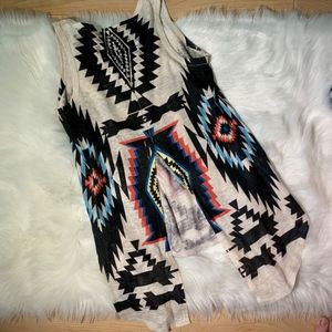 This Aztec/ Tribal colored blouse, has a high low style cut, with a slit in the back that goes from the bottom of the shirt to about mid to lower back.