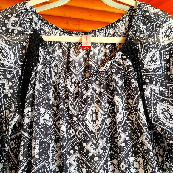 Beautiful, never worn aztec print blouse with tie front and elastic around hem sz lrg. 22 in length. P2P 23in