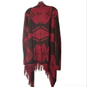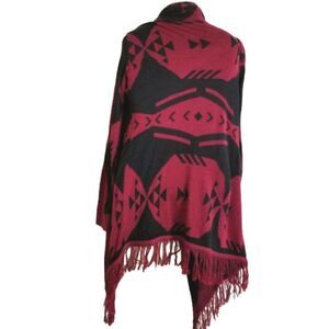 Aztec Design Maroon and Black Fringed Open Front Shawl L