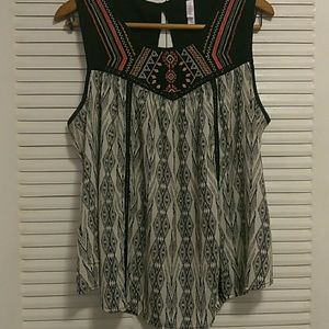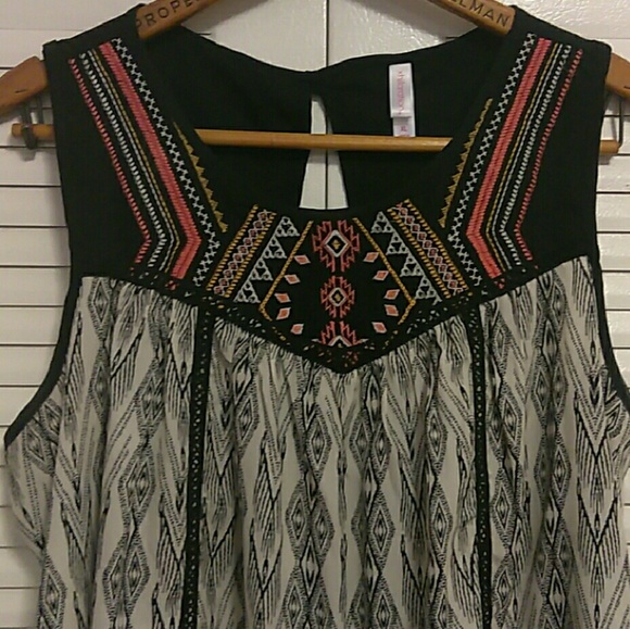 Loose fit blouse with gorgeous Aztec embroidery on upper chest area in shades of orange and gold.The colors look amazing against the mainly black and white top. Has a button closure on the back neck area. Excellent used condition. No damages