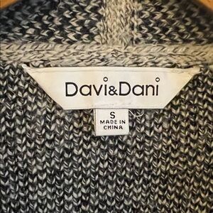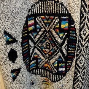 Stylish gray cardigan with bold patterns. Features open front and pockets. Perfect for layering.
