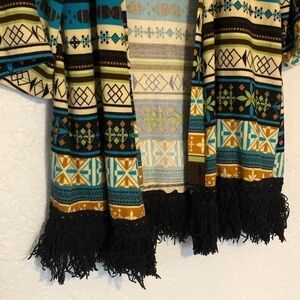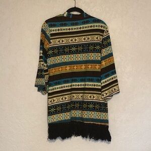 Aztec Inspired 3/4 Sleeve Tunic Cardigan By Jody California Sz L. Made in the USA, black fringe at bottom hem. In excellent condition, vibrant pattern!