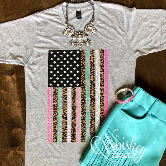 This soft gray unisex, V neck tee has a bright aztec with leopard printed flag.