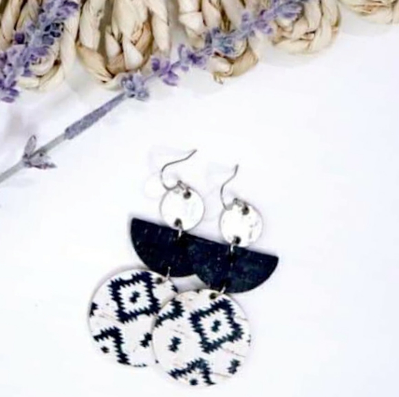 Beautifully patterned cork, acrylic and leather dangle earrings.