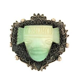 Aztec Mask Green Jade Carving Sterling Silver 925 Brooch Pin Made in Mexico