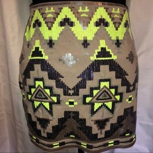 Express Aztec mini skirt Tan/grayish color Neon yellow/green sequins NWOT Elastic waist