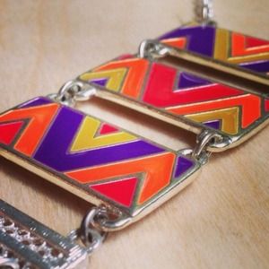 Foxy pieces are handmade from fine pewter & plated in sterling silver. All Foxy jewelry is lead & nickle free. This particular piece is adorned w/ a bright colored pendant-colorful zigzag bars has been worn handful of time no signs of wear. Total necklace length is 33" laid flat end2end each bar measures 1.25" W each 1/2" tall total length of pendant is 6" drop, including silver chain tassel (that measures 3" long)❌NO TRADES❌NO HOLDS❌