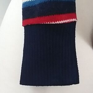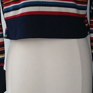 Vibrant and colorful sweater jacket cardigan. Has aztec and native style geometric prints and stripes. The back waistband is ribbed like a jacket as are the sleeves. The front has an open cardigan look with a flattering waterfall front. Lightweight soft knit with lots of stretch. In excellent pre-owned condition with no flaws. No tags so please refer to measurements below.