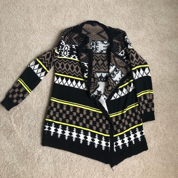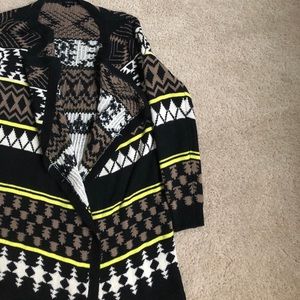 Beautiful double stitched Aztec long in front open sweater. Modern neon yellow, with classic brown white and black Aztec design. Very comfortable warm. Easy to wear to work and out and about. No signs of wear and tear! One of kind sweater. I promise a Million compliments will come your way when you were this!