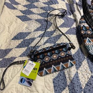 Stylish backpack and pouch set with Aztec pattern. Features a mix of blue, brown, and white colors.