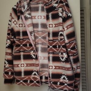 Cozy fleece jacket with an Aztec pattern. Features a zip-up front and hood. Perfect for chilly days.