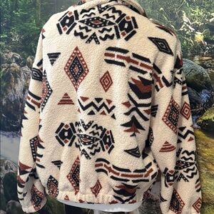 Cozy fleece jacket with an Aztec pattern. Features a zip-up front and warm design. Perfect for chilly days.