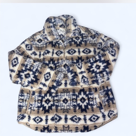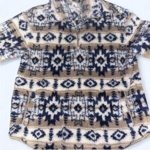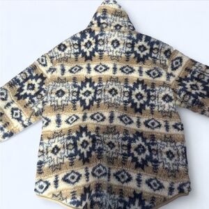Cozy fleece pullover with an Aztec pattern. Features a blend of navy and tan colors.