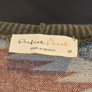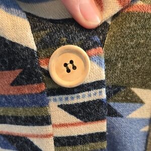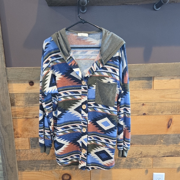 Stylish hooded cardigan with an Aztec pattern. Features a mix of blue, brown, and cream colors, wood style button . Perfect for casual wear. Material is more of a light tee shirt material.