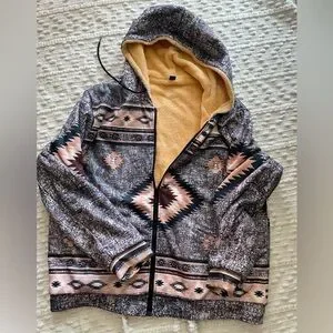 Stylish hooded jacket with Aztec pattern. Features a cozy tan lining.