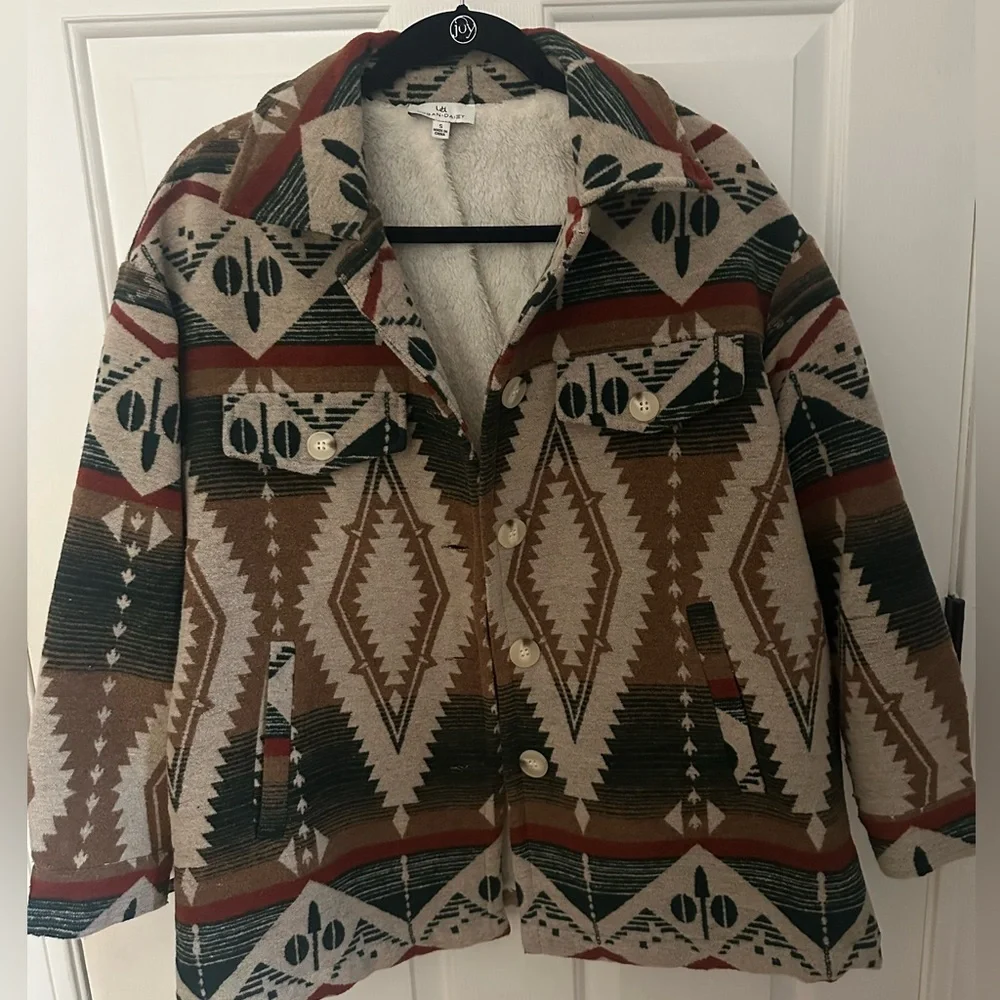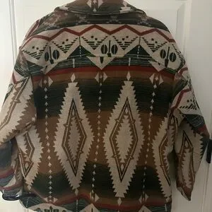 Stay stylish and warm with this geometric pattern jacket. Featuring a blend of earthy tones, this jacket is perfect for any casual outing.